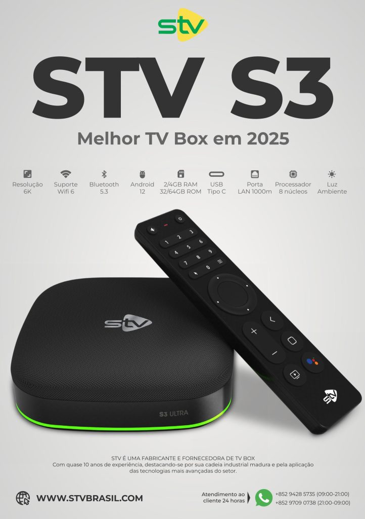 STV S3 Pro - 6K - 2/32GB - Wi-Fi - Bluetooth - Android 12 - Comando de voz - 2025 Receptor IPTV (Sem Antena) STV S3 Pro - 6K - 2/32GB - Wi-Fi - Bluetooth - Android 12 - Comando de voz 2025     ... R$755,00