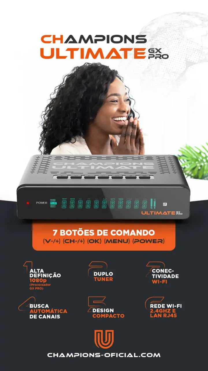 Champions Ultimate Gx Pro Receptor Champions Champions Ultimate Gx Pro   Receptor Champions Ultimate GX PRO: Desfrute de imagens Full HD 1080p com o processador GX6628 e conectividade versátil via Wi-Fi e Ethernet. Navega&c... R$465,00